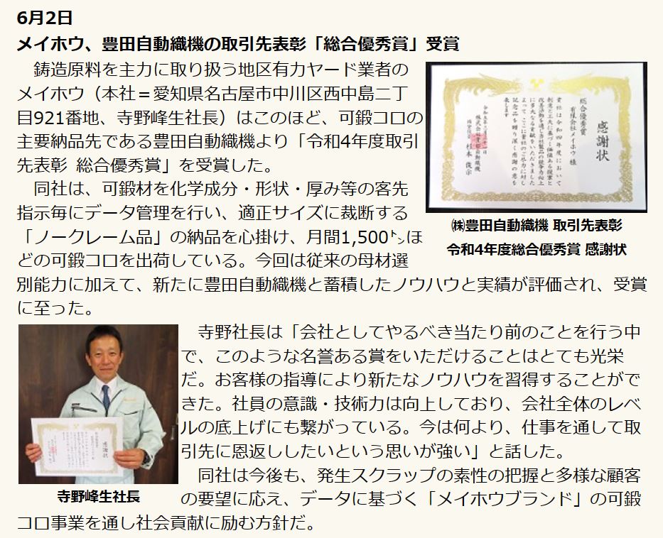 豊田自動織機様より令和4年度総合優秀賞を受賞しました 2023-05-26 07:11:04 UTC この度、豊田自動織機様から総合優秀賞という大変栄誉ある賞を受賞致しました。 日々蓄積してきた弊社の選別ノウハウと機動力を評価して頂きました。 豊田自動織機様からパートナーとしてのご評価を頂き、名誉ある賞まで拝受しこの上ない喜びです。 これからも社員一同、一丸となり「メイホウブランド」の名にふさわしい商品を製造してまいります。 2022年度総合優秀賞_受賞写真 2022年度総合優秀賞_感謝状 日刊市況通信 2023年6月2日記事として取り上げてもらいました